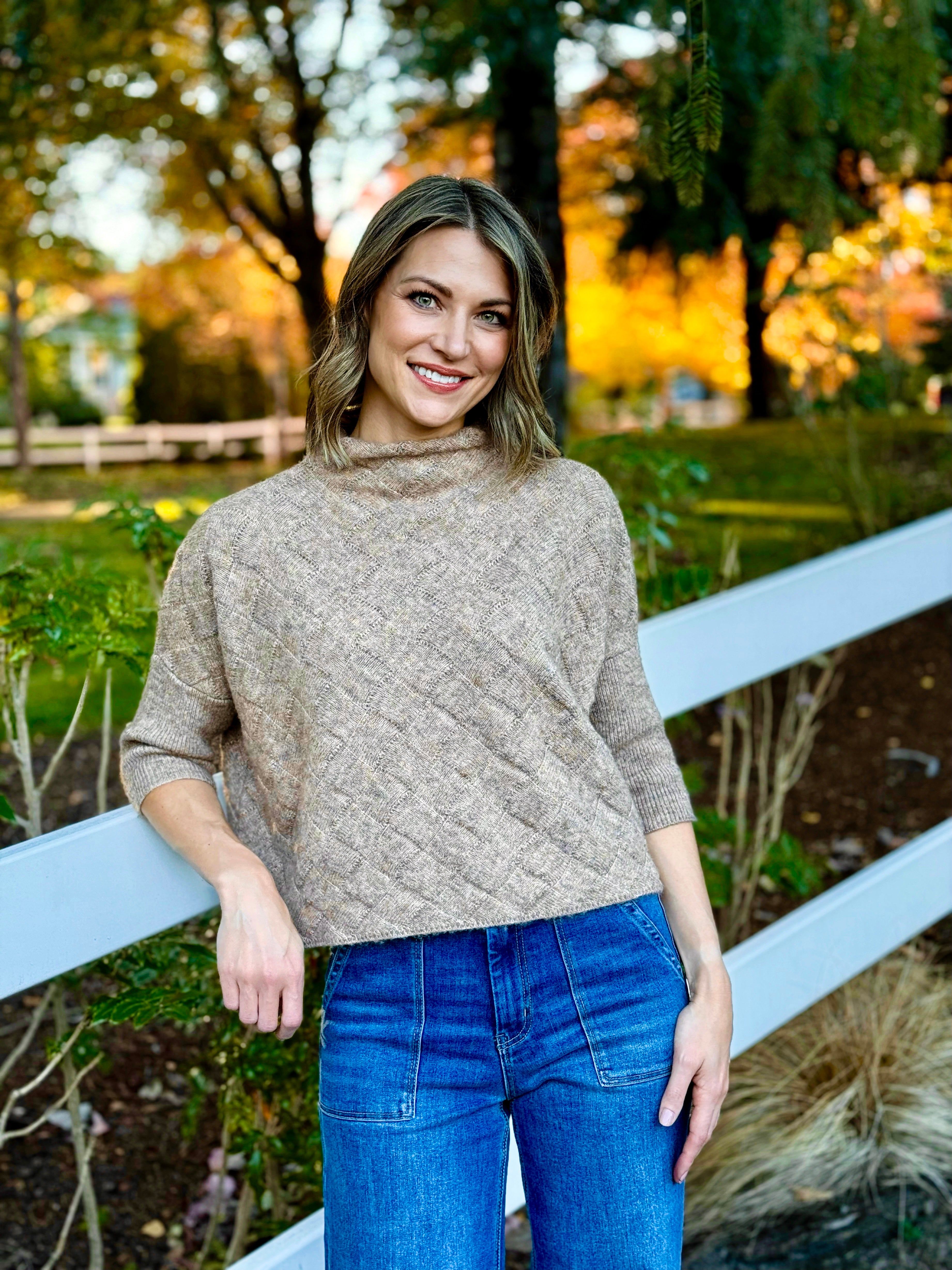 Our Kerisma Rowena Sweater in Woodsmoke is a relaxed fit boat neck top with fitted 3/4 sleeves in mega basketweave pattern. Pairs beautifully with high waisted trousers or over a fitted dress.
