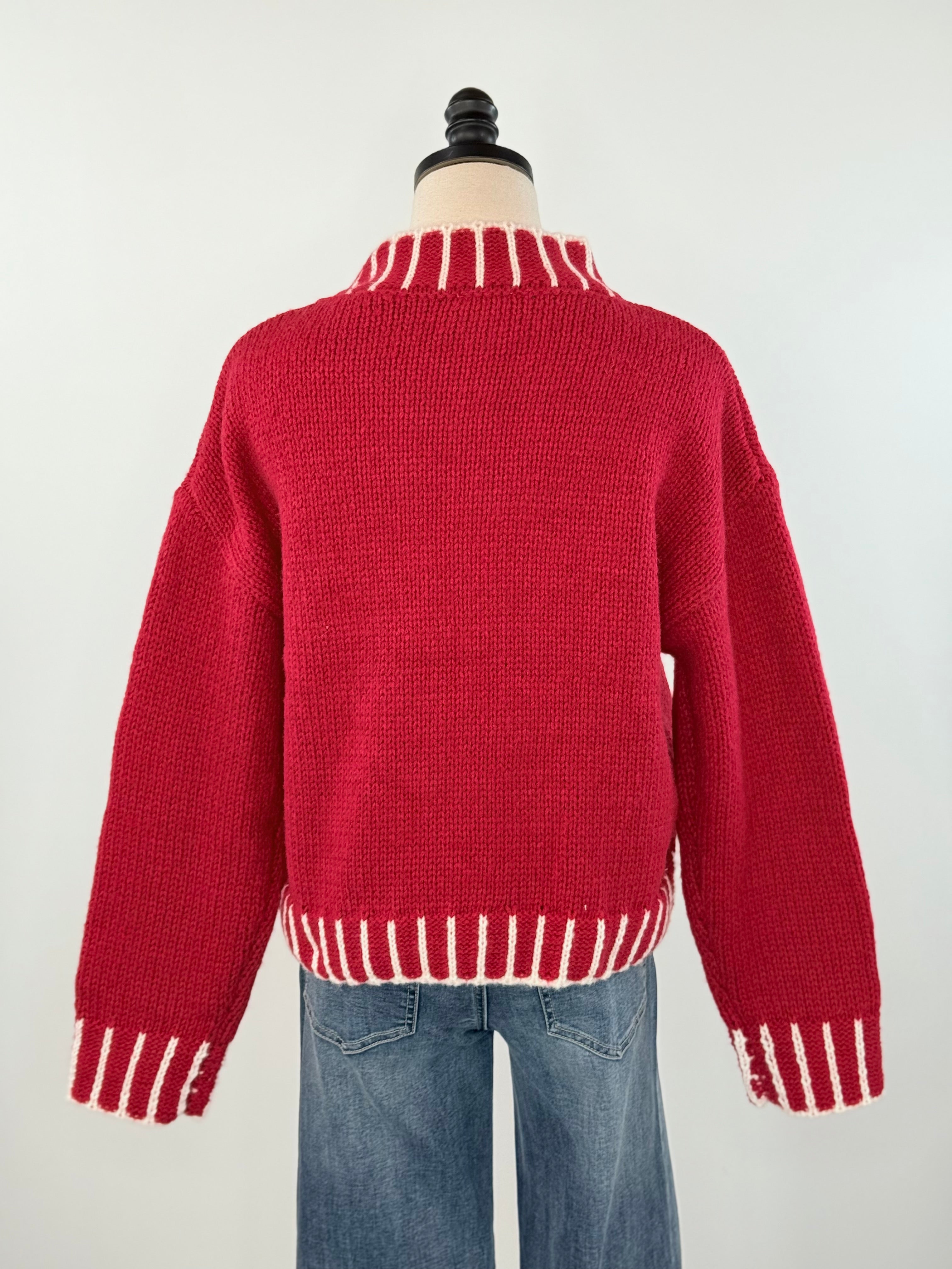 The Snow Flake Sweater in Red and Ivory features long sleeves with drop shoulders, a mock neck, and a comfortable, relaxed fit with a standard length. This cozy, heavyweight sweater is adorned with raised snowflakes on the front and detailed stitching along the neck, cuffs, and hem. It pairs perfectly with your favorite jeans for an easy, festive look during your holiday gatherings.