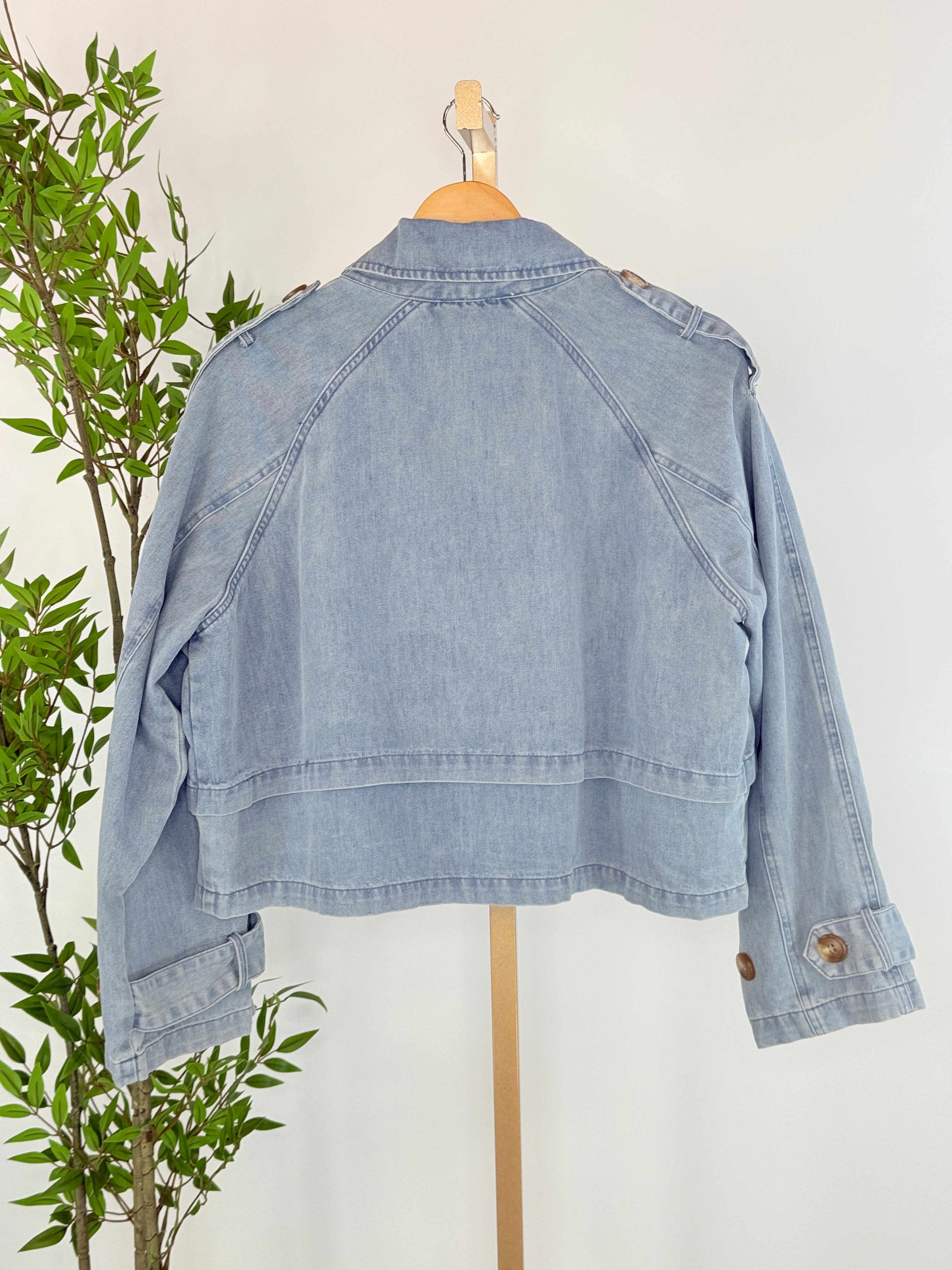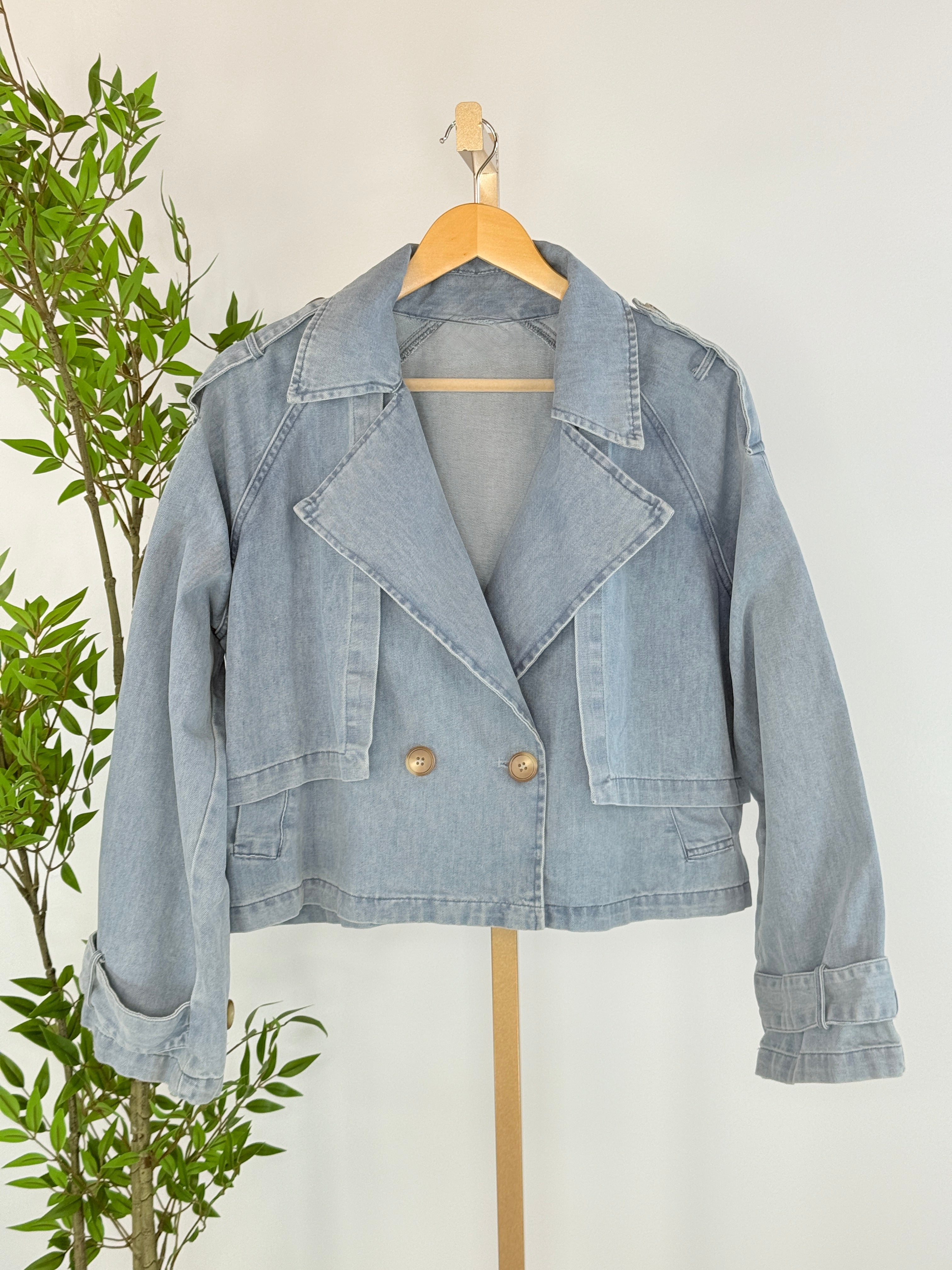 Meet your new layering hero. The Taylor Denim Jacket brings a fresh, feminine twist to classic denim with its soft wash, tailored silhouette, and chic crop length. Designed with a subtle double-breasted front and utility-inspired details, this jacket balances structure and ease in all the right ways. Crafted from lightweight denim, it’s perfect for year-round styling/ Wear it over dresses in spring, pair it with high-waisted denim for a modern double-denim moment, or layer it over knits as the seasons shift. Thoughtful details like cuffed sleeves, shoulder accents, and warm neutral buttons elevate this everyday essential into something truly special.