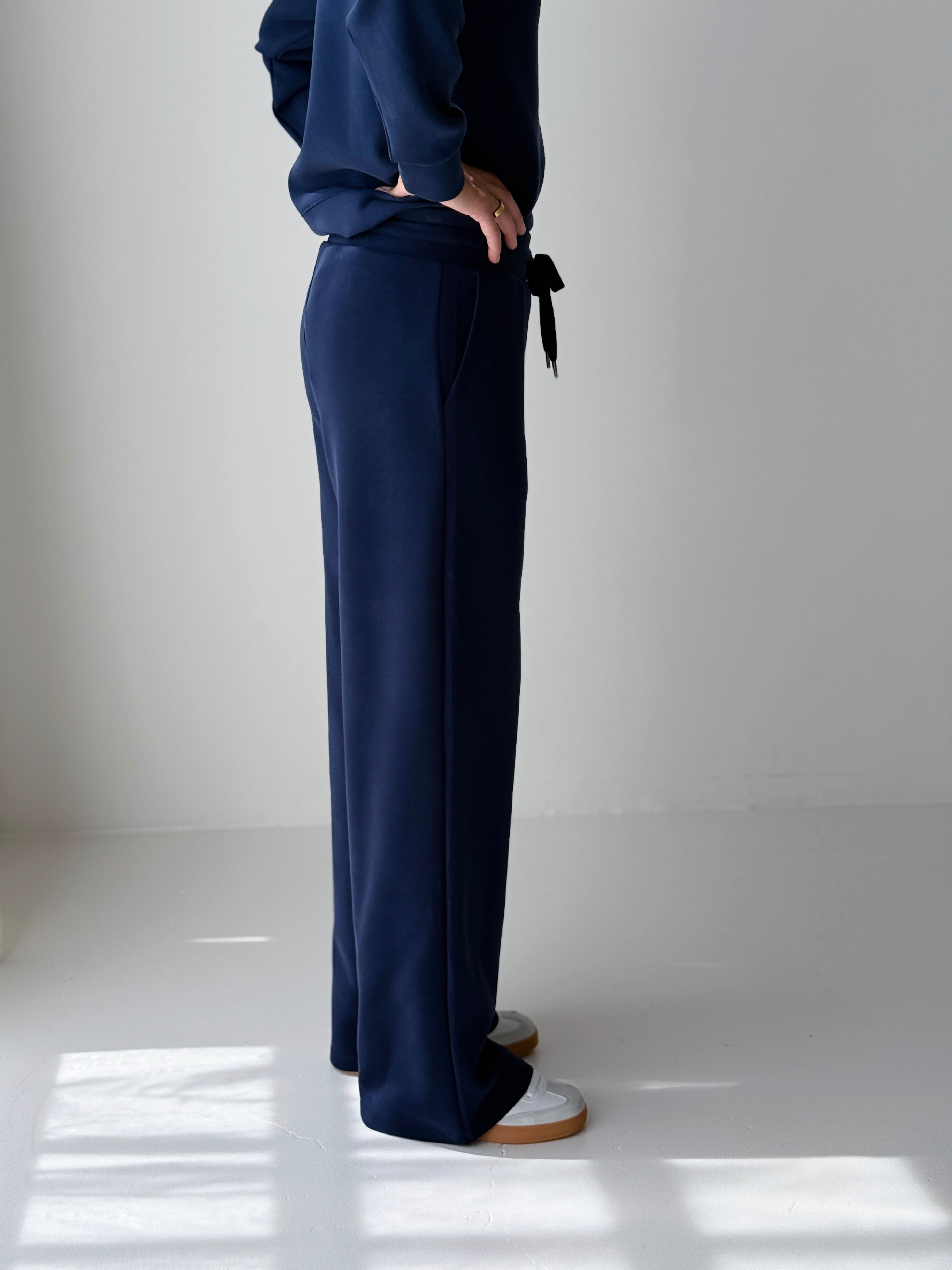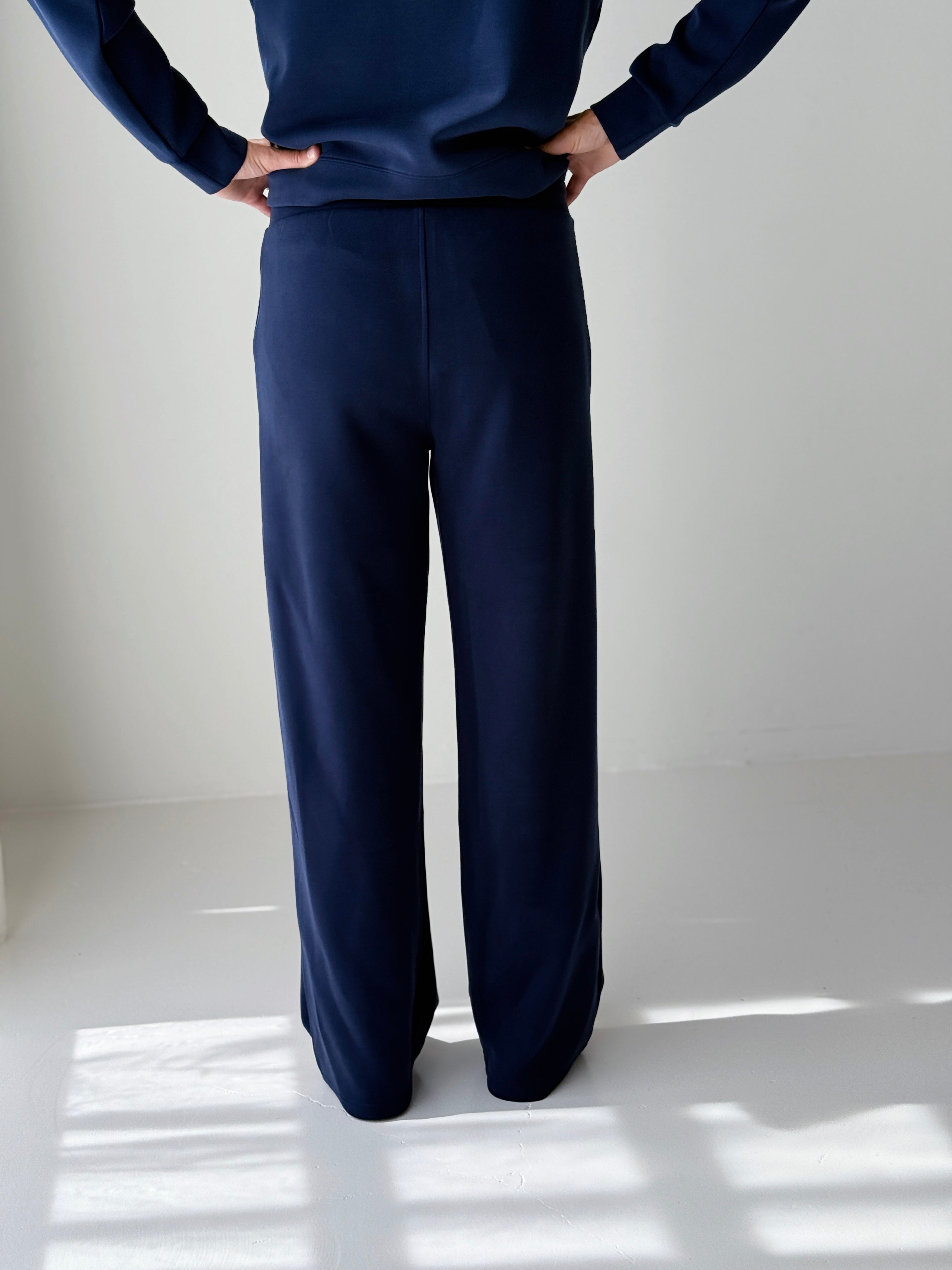 Made to wear everywhere, these Thread and Supply Kai Pants in Deep Blue are a comfy, elastic waist pant with adjustable drawstring. Featured in a drapey scuba fabric that is super sueded and soft! Has dual side pockets and a straight cut. Pair with the Thread and Supply Kia Mockneck in Deep Blue to complete the set (pictured).