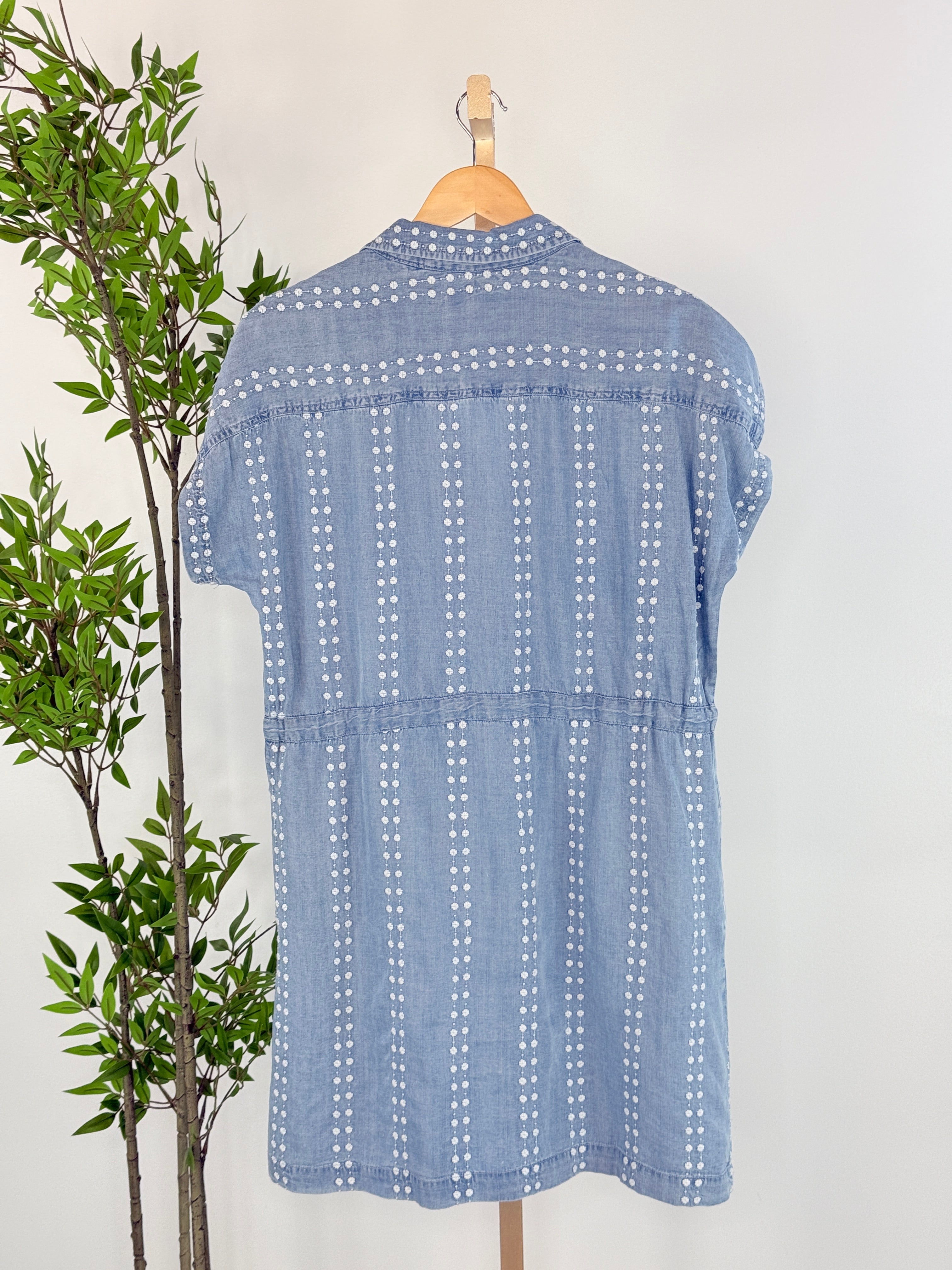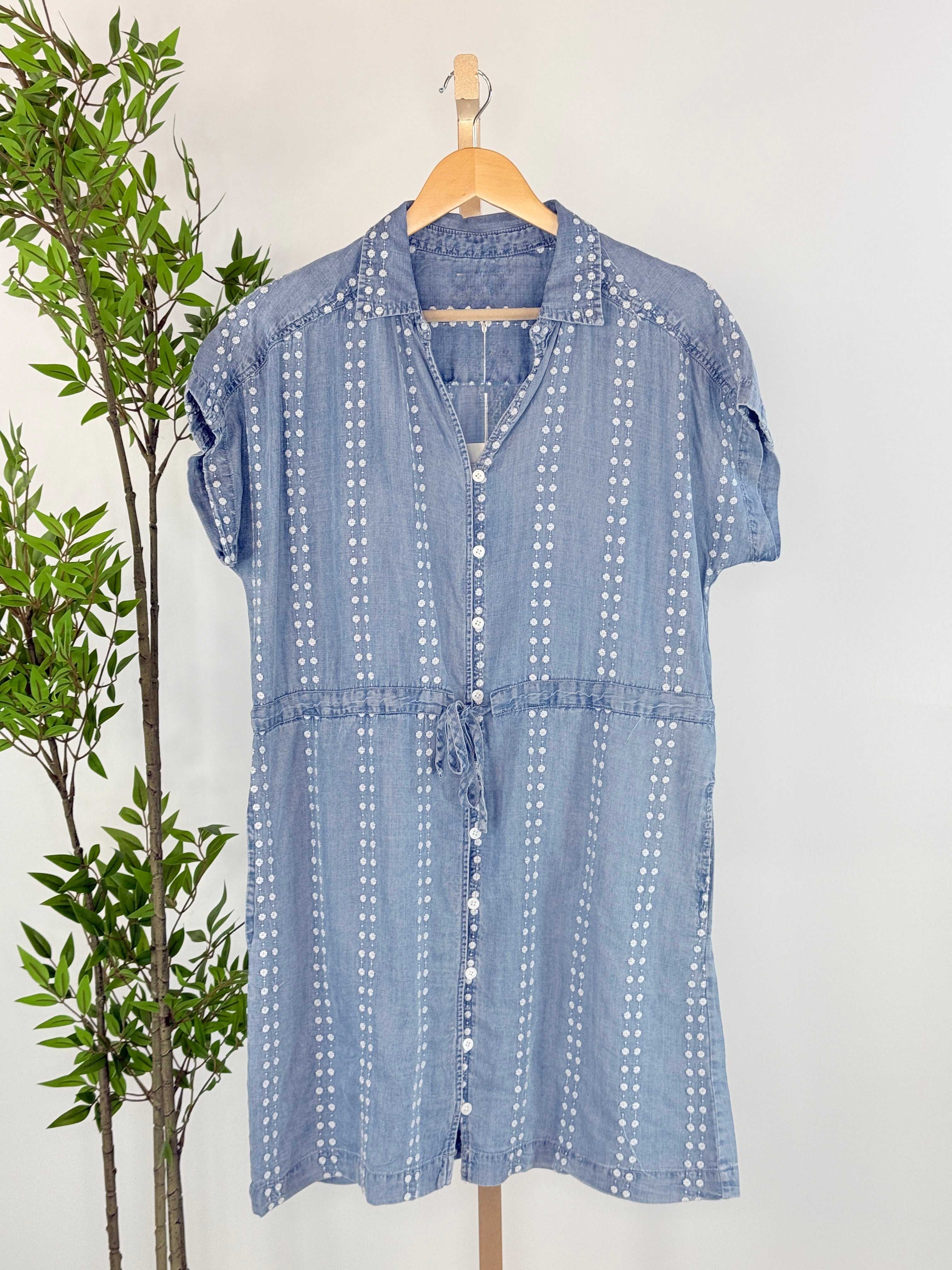 This charming Thread and Supply Natalia Dress in Daisy Stripe features convenient button-front styling and a flattering tie waist that lets you adjust the fit. Short sleeves and handy side pockets make it perfect for everyday wear. Dress it up with sandals or keep it relaxed with your favorite sneakers for an effortlessly versatile look. Length: 36"