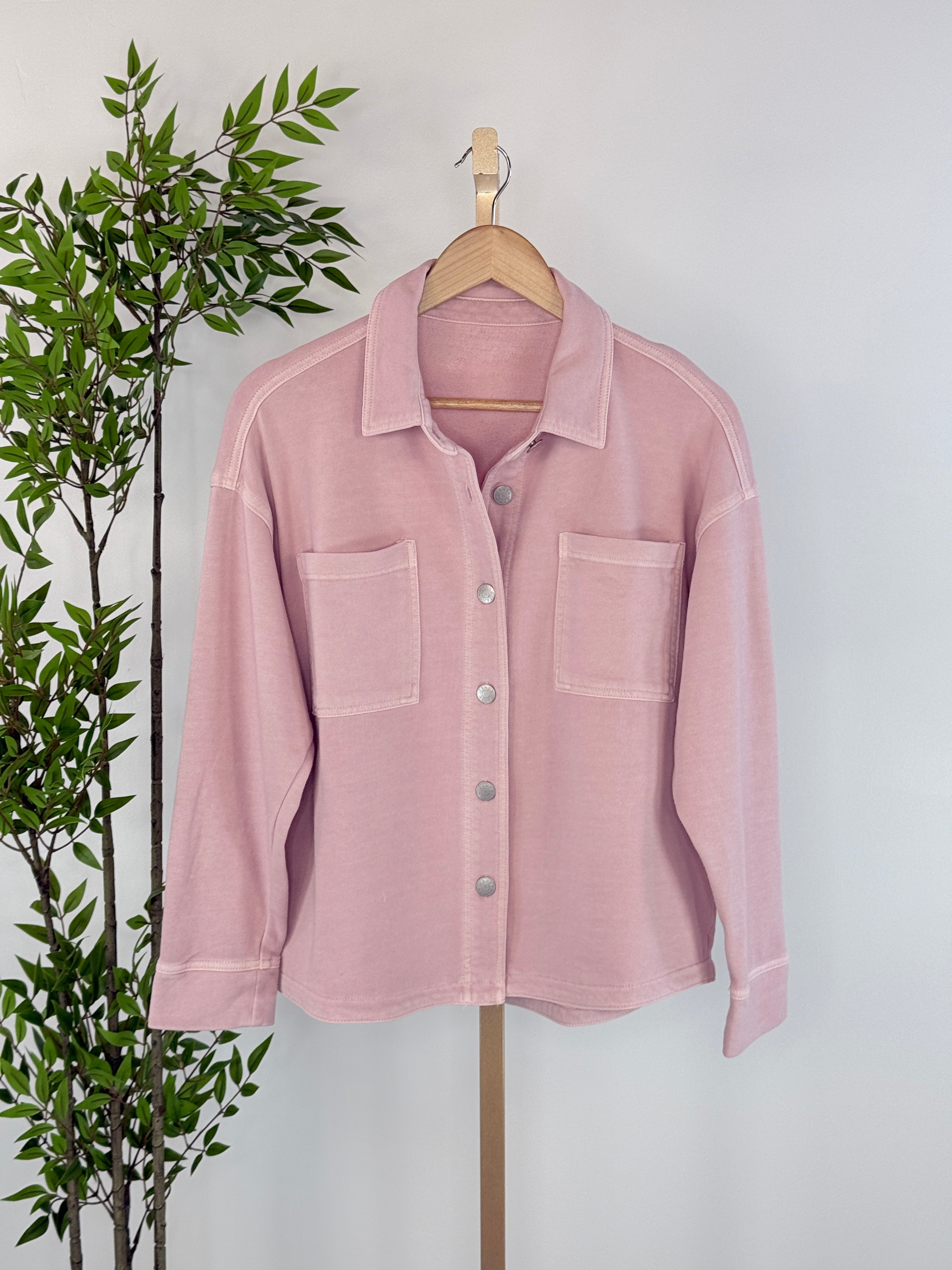 Meet your new favorite layering piece. The Weekend Button-Up Jacket in Dusty Pink blends the comfort of a cozy knit with the structure of a classic button-up, making it an easy go-to for everyday wear. Designed in a soft blush pink hue, this piece adds warmth and subtle color without feeling heavy or bulky. Featuring a collared neckline, snap-button front, and front patch pockets, it has a clean, timeless look with just the right amount of detail. The relaxed fit and soft fabric make it perfect for wearing over tees, tanks, or lightweight knits—ideal for casual days, travel, or lounging in style.