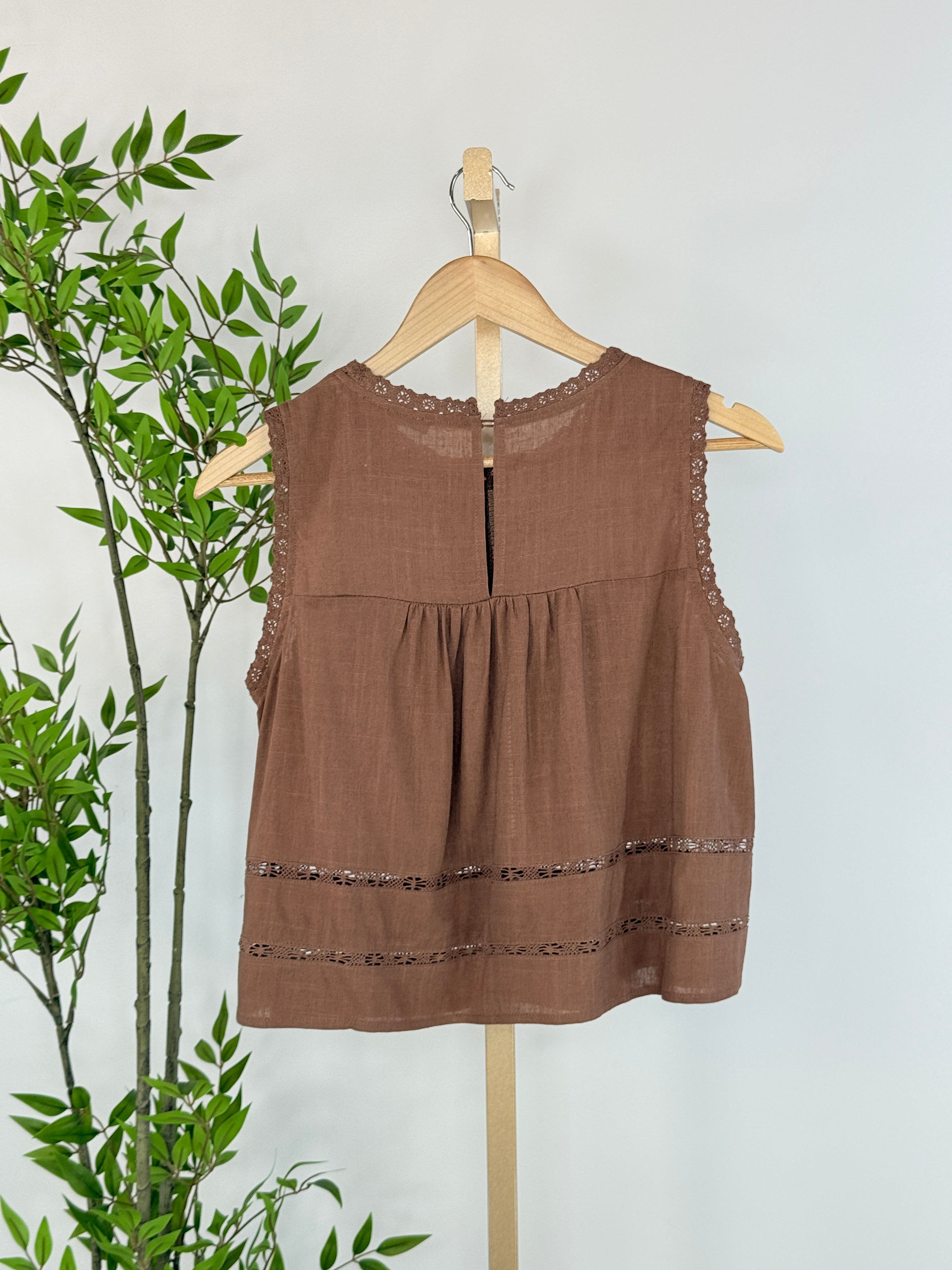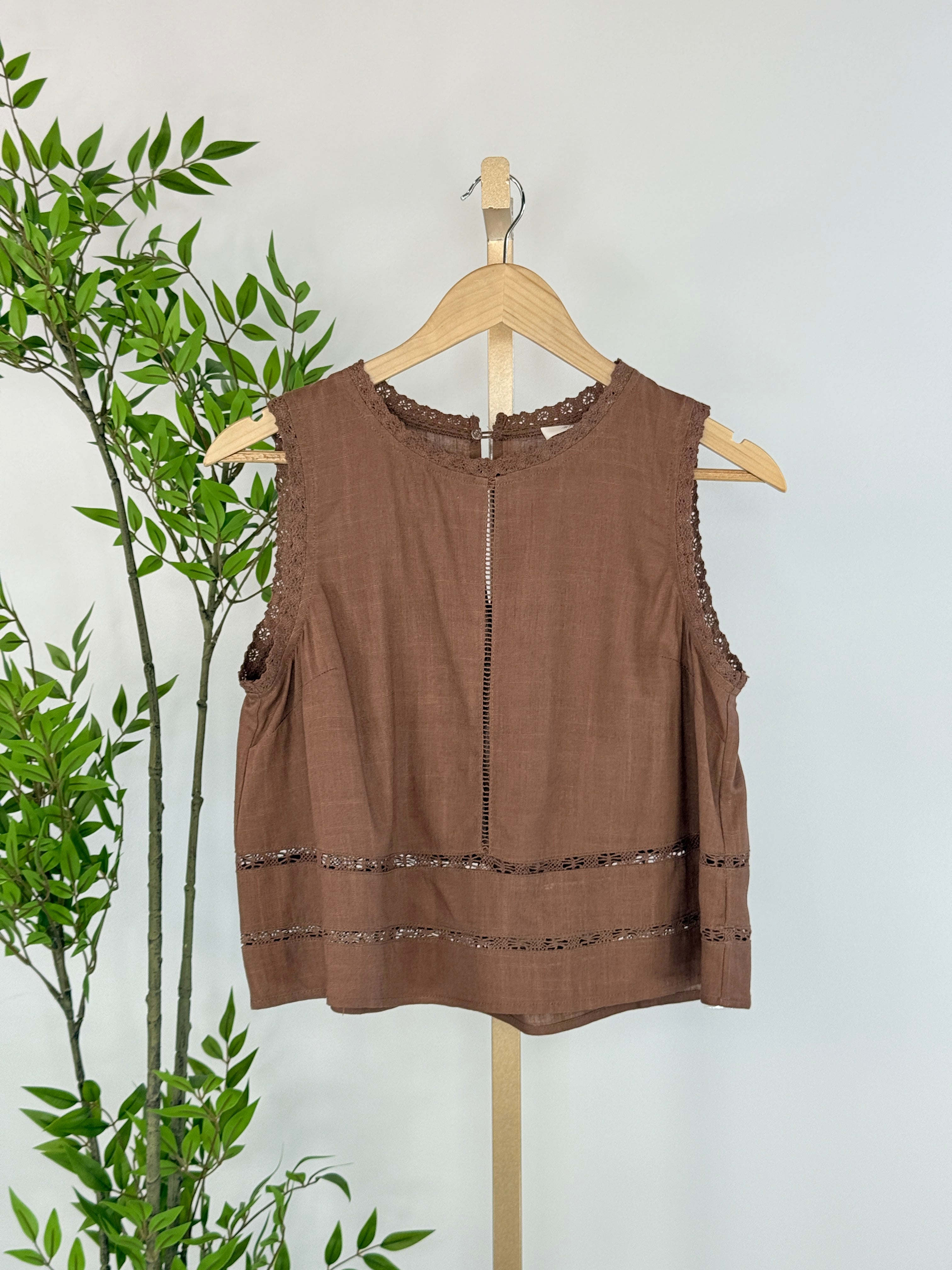 Warm, feminine, and beautifully detailed, the Willa Top in Choco Mousse is a timeless piece with an artisanal feel. Crafted in a rich earthy brown, this sleeveless blouse features delicate ladder-lace trim throughout and soft lace edging along the armholes and neckline for subtle texture and charm. The lightweight woven fabric drapes effortlessly, while the relaxed silhouette keeps it comfortable and easy to wear. Thoughtfully designed for everyday versatility, this blouse pairs perfectly with denim, tailored trousers, or a flowing midi skirt. For a complete outfit pair with our Grace Skirt in Choco Mousse (pictured).
