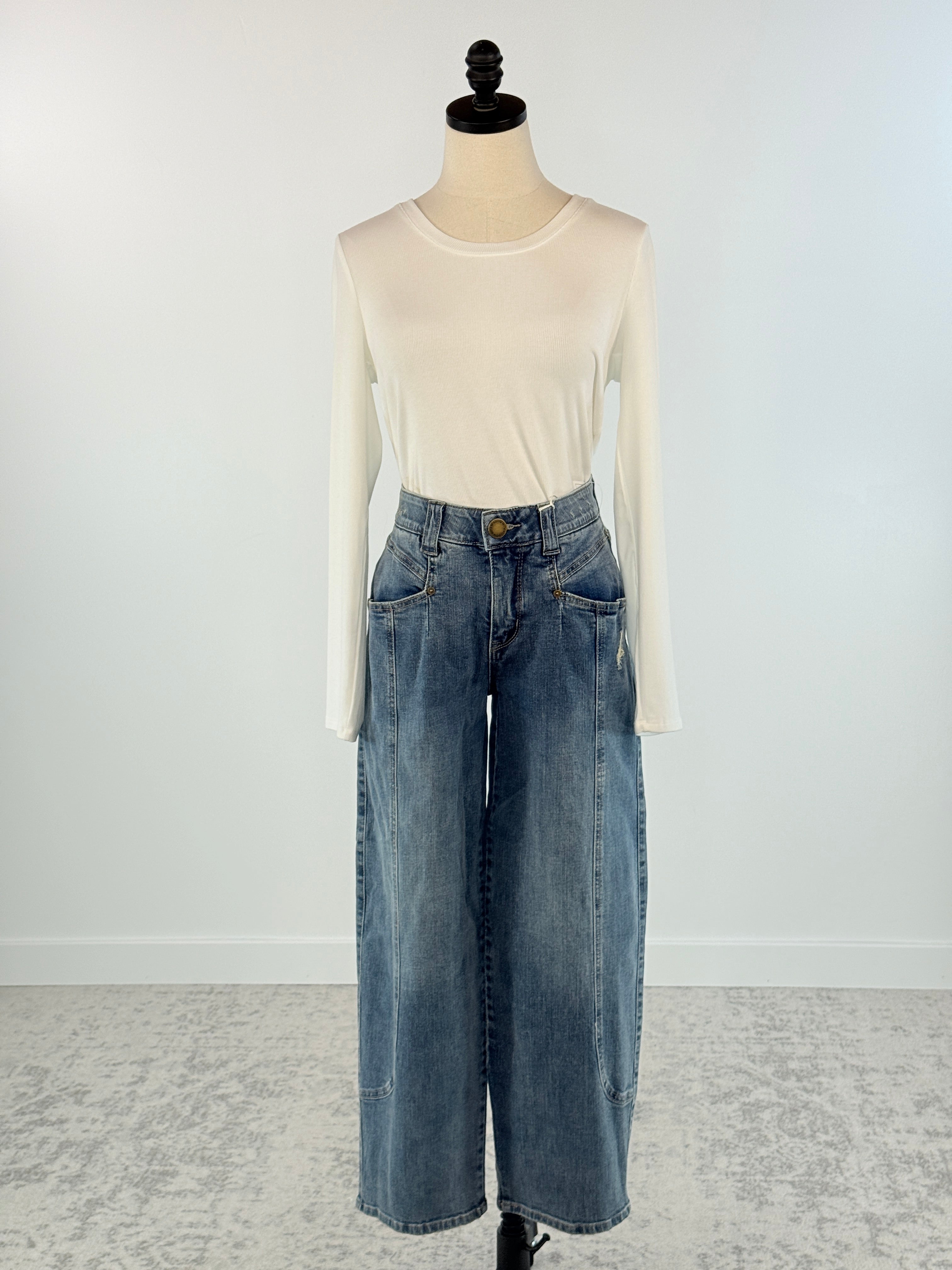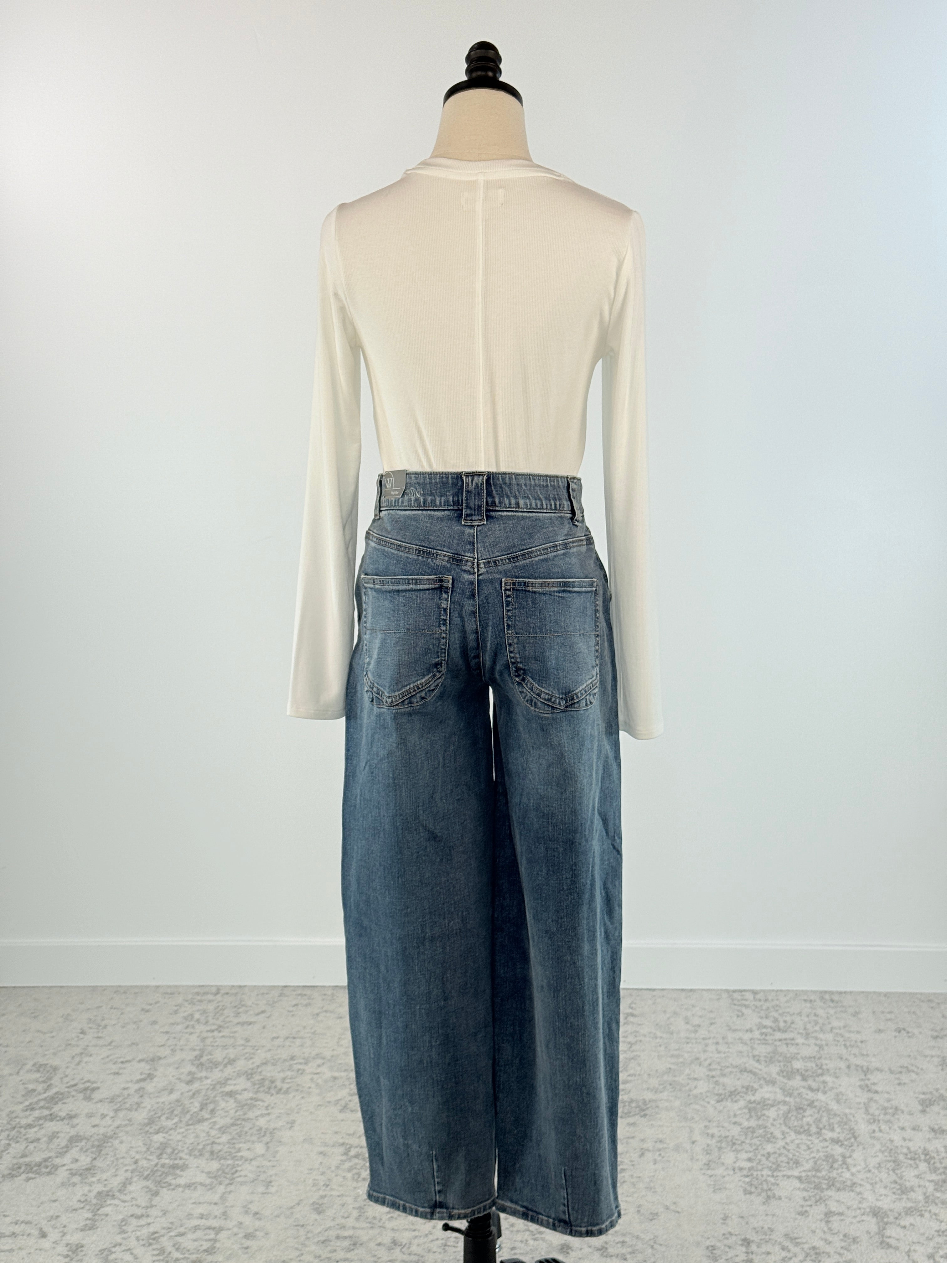 Embrace effortless style with these Wit and Wisdom Barley Barrel High Rise Denim in Artisnal that balance comfort and contemporary flair. The relaxed silhouette skims gently through the hips and thighs before opening softly at the knee - refined take on the barrel-leg trend. Crafted in a mid blue wash, they pair seamlessly with everything from tucked tees to oversized sweaters. Practical details include a zip fly with button closure, front slant pockets, and back patch pockets for everyday functionality.