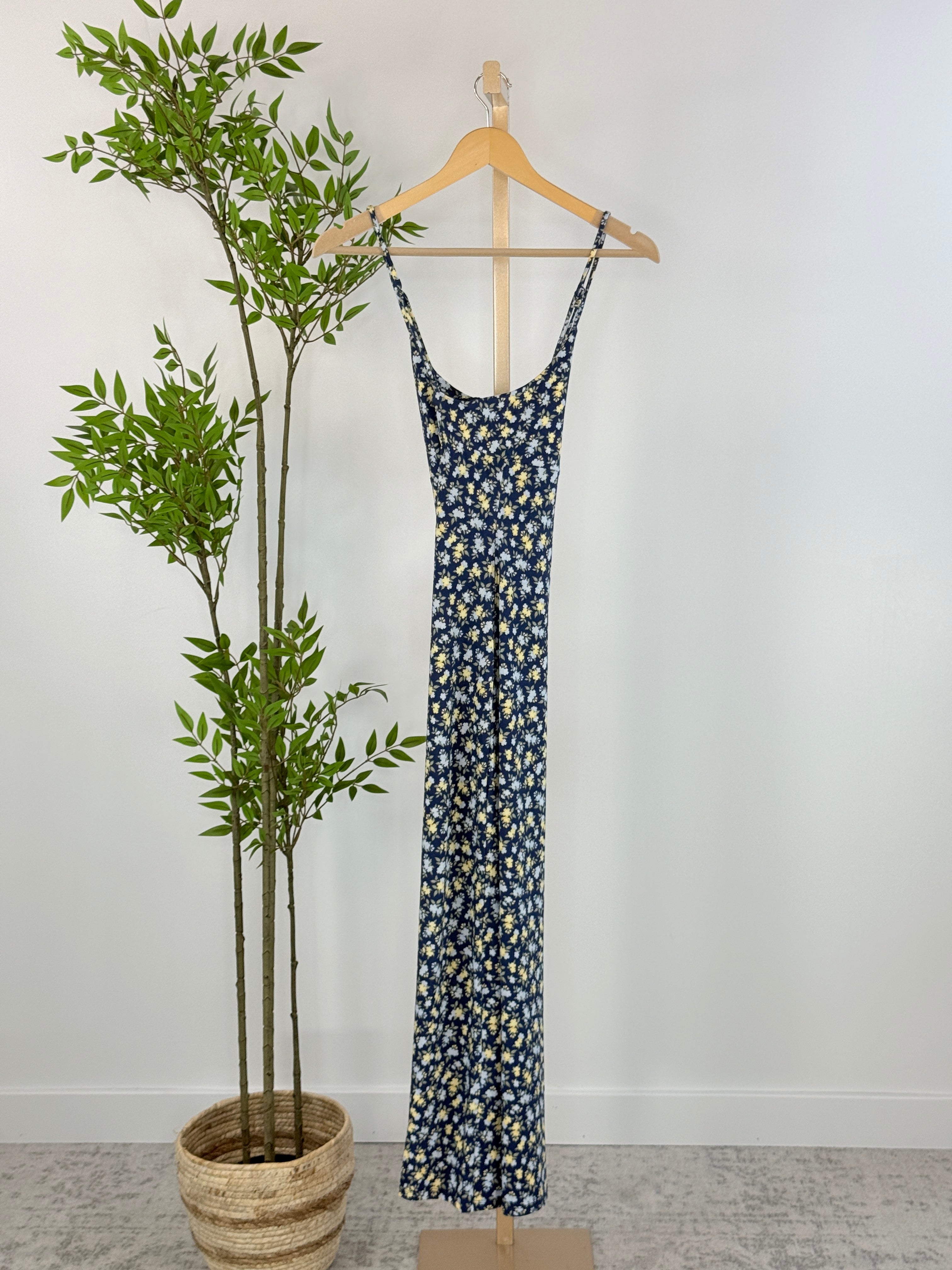 Effortlessly elegant, this sleeveless midi dress features a flattering scoop neckline and adjustable spaghetti straps in a charming ditsy floral print. The maxi length offers graceful coverage perfect for any occasion. Layer it with a lightweight cardigan or denim jacket when you need extra warmth, making it a versatile piece that transitions beautifully from day to evening.